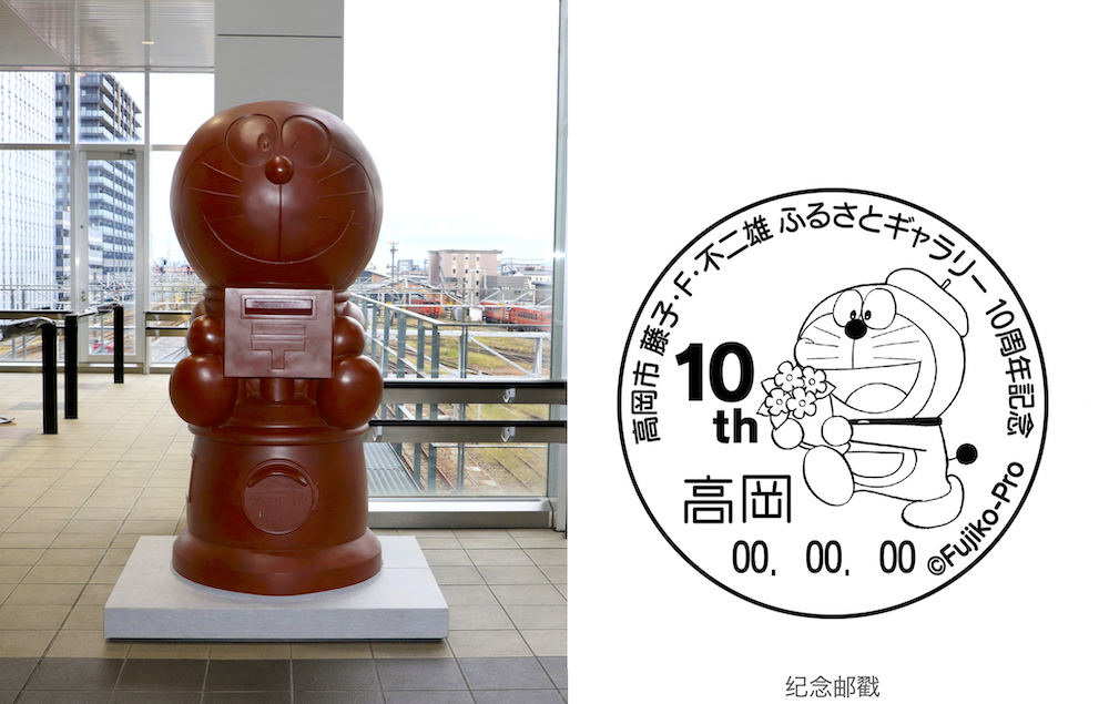 设置在高冈车站剪票口前的哆啦A梦邮筒,会在投递的邮件,会盖上纪念设计的邮戳。这次的纪念邮戳设计,将变更为「藤子・F・不二雄故乡画廊 10 周年纪念」设计。